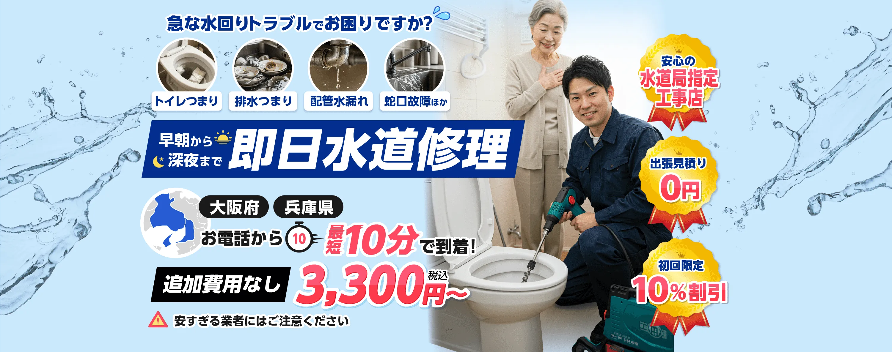 大阪・兵庫の水回りトラブルを、早朝から深夜まで即時対応でスピード解決!お電話から最短10分でスタッフが現地に急行。